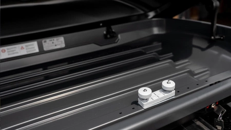 Box wykonany jest z trwałego tworzywa ABS i wykończony w eleganckim czarnym połysku, dzięki czemu świetnie komponuje się z sylwetką samochodu. System montażu oparty o obejmy typu „U” (80 mm) z metalową blachą wzmacniającą i wygodnymi pokrętłami gwarantuje szybki montaż i solidne trzymanie się belek bazowych.